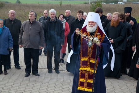 Но вот, наконец, подъехал и владыка - митрополит Псковский и Великолукский Евсевий. В сопровождении клира мы, всего человек тридцать, по мощеной дорожке двинулись к холму. А он стоял огромный на широком основании из гранитных валунов, раскинув могучие руки-крылья, и будто бы призывал нас в свои объятия. Сколько раз ни доводилось мне за последние четыре года ходить этим маршрутом, в какую бы погоду или время суток это ни случалось, чувство, овладевавшее мной, всегда было одним и тем же: странное чувство успокоения, отрешения от мыслей и забот, и сосредоточения в Боге.