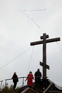 Вдруг – мы даже вздрогнули от неожиданности – одна из женщин громко вскрикнула и указала рукой на небо. Прямо над нами, в считанных десятках метров мощно, геометрически безупречно летел журавлиный клин. По сути, повторилась картина четырехлетней давности, когда точно в такой же день, на освящении Холма, в момент приношения земель огромный крест приглянулся невесть откуда взявшемуся аисту (по времени эти птицы давно уже должны были улететь на юг); он сел на плечо голгофы, внимательно осмотрел тысячную толпу, затем неожиданно для всех спустился вниз и начал деловито прогуливаться среди народа. И вот опять: в момент принесения земель, сразу после молебна в небе появились птицы!